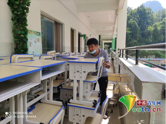 志愿者张凯在凤城镇一居民疏散安置点搬桌椅。张凯 供图