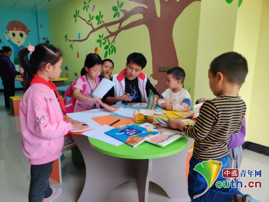 凤山县团委组织西部计划志愿服务队参与思源社区青空间四点半课堂活动。图为志愿者张凯陪伴孩子们在图书室阅读书籍。张凯 供图