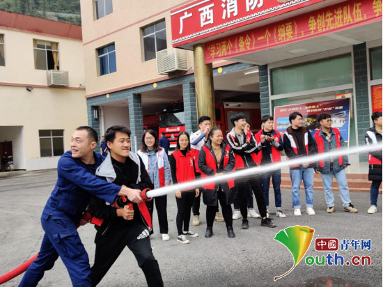 凤山县志愿者服务队消防安全知识培训。图为张凯参加消防灭火器械操练。张凯 供图