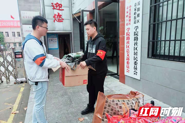 湖南理工学院环境保护协会学生志愿者们捐赠衣物,以帮助辖区困难群众。
