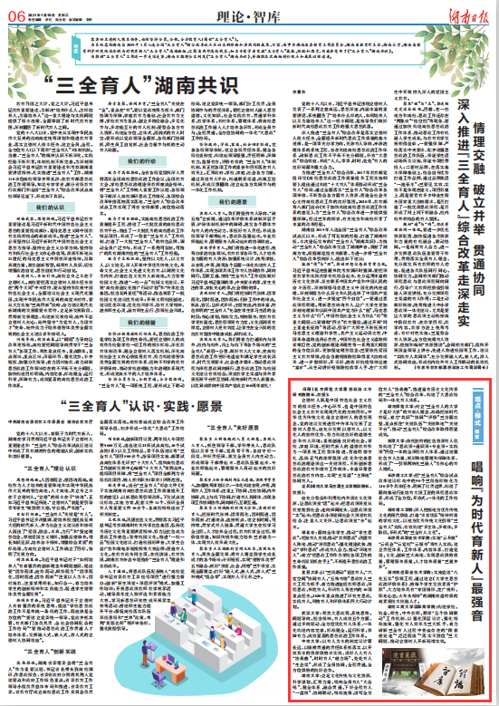 湖南师范大学:树立“三全育人的大学才是好大学”的育新人理念,准确把握时代特征,着力“共识”“协同”“评价”三方面攻坚,重点抓住“关键队伍”“关键阵地”“关键平台”,推动“三全育人”综合改革取得明显成效。