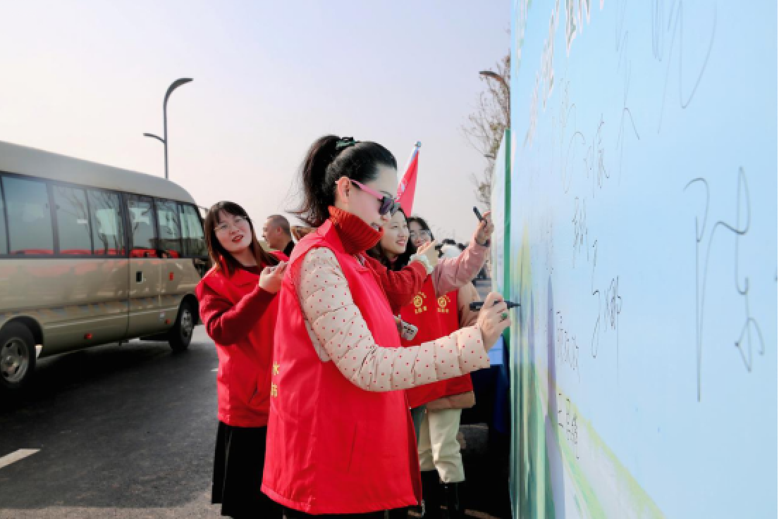 湖南理工学院新闻传播学院“新火相传”志愿服务队与岳阳市林业局同志在君山区长江大堤安保大道签名致力创森工程