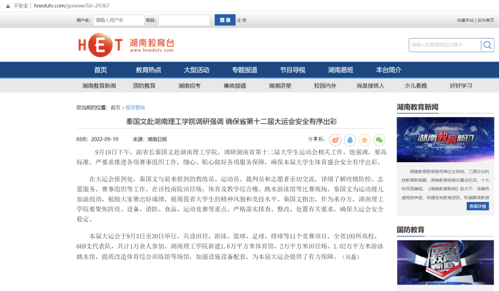 秦国文赴湖南理工学院调研强调 确保省第十二届大运会安全有序出彩