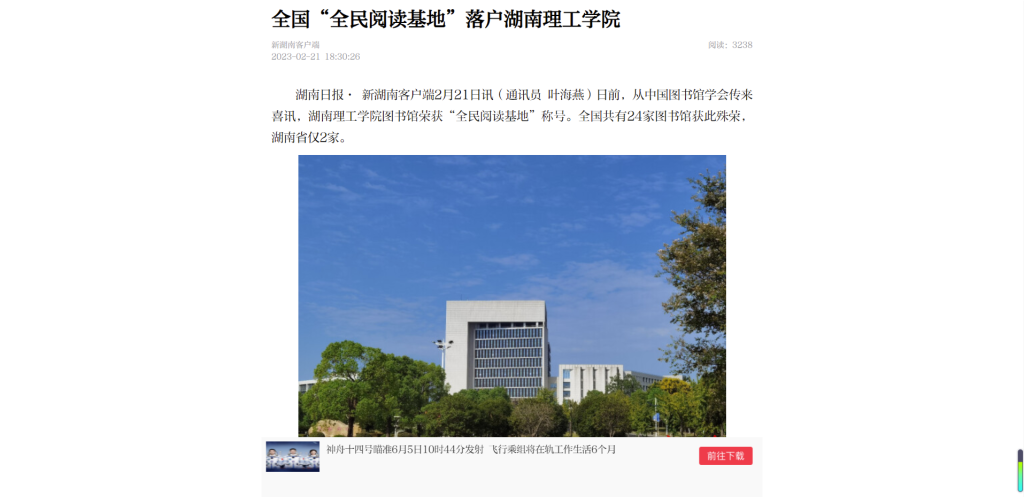 湖南日报·新湖南客户端2月21日讯(通讯员 叶海燕)日前,从中国图书馆学会传来喜讯,湖南理工学院图书馆荣获“全民阅读基地”称号。全国共有24家图书馆获此殊荣,湖南省仅2家。