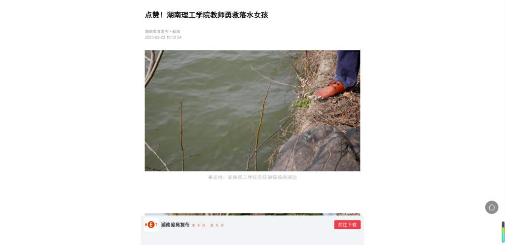2月19日傍晚,湖南理工学院法学院副院长尹晓闻正准备夜跑,忽然耳边传来求救声,尹晓闻立刻跑向校园东院训练馆南湖岸边。发现离湖岸一到两米处,一个女孩的身体大部分已经被水淹没,只有头部偶尔能伸出湖面。意识到女孩情况危急,尹晓闻将手里的物品丢到一旁,立刻借助周边物体将她拉近湖岸,最终将女孩救上了岸。