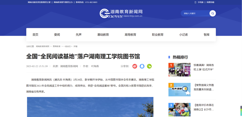 湖南教育新闻网讯(通讯员 叶海燕)2月20日,新学期开学伊始,从中国图书馆学会传来喜讯,湖南理工学院图书馆在2021年全民阅读工作中组织得力、成效突出,荣获“全民阅读基地”称号。全国共有24家图书馆获此殊荣,湖南省仅有两家。