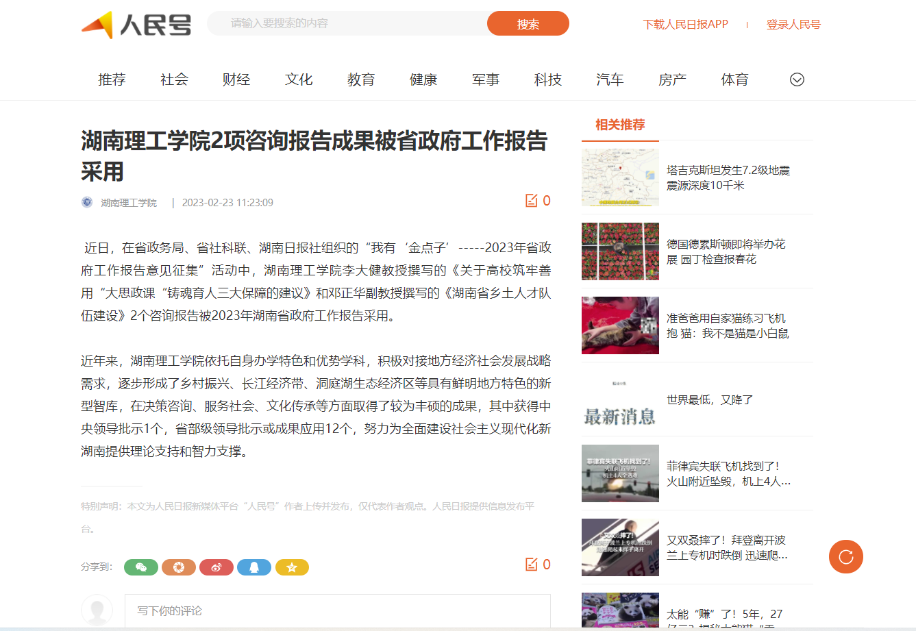 近日,在省政务局、省社科联、湖南日报社组织的“我有‘金点子’-----2023年省政府工作报告意见征集”活动中,湖南理工学院李大健教授撰写的《关于高校筑牢善用“大思政课“铸魂育人三大保障的建议》和邓正华副教授撰写的《湖南省乡土人才队伍建设》2个咨询报告被2023年湖南省政府工作报告采用。