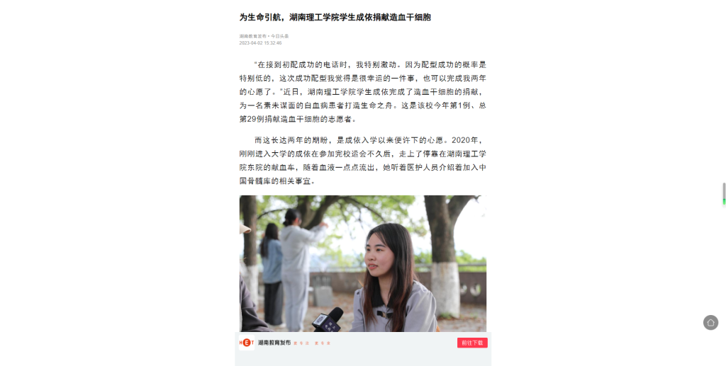 为生命引航,湖南理工学院学生成依捐献造血干细胞