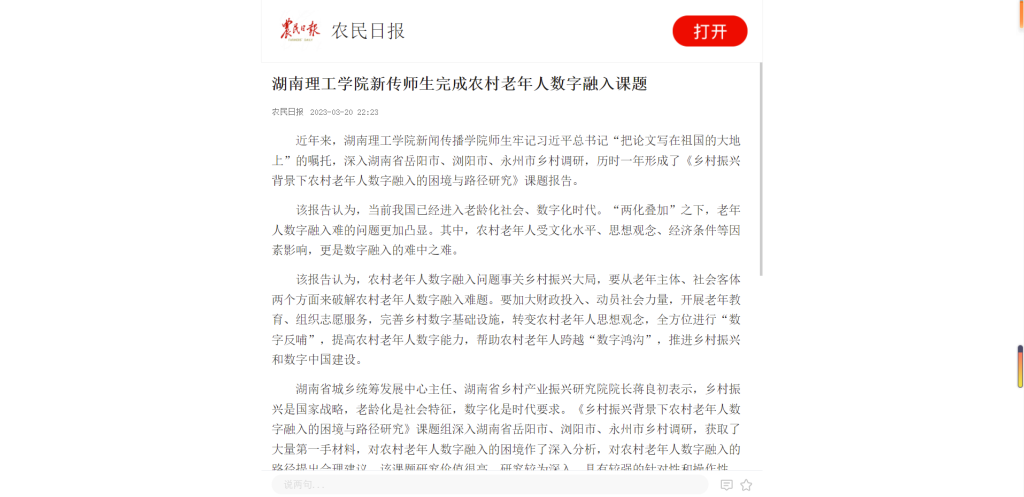 近年来,湖南理工学院新闻传播学院师生牢记习近平总书记“把论文写在祖国的大地上”的嘱托,深入湖南省岳阳市、浏阳市、永州市乡村调研,历时一年形成了《乡村振兴背景下农村老年人数字融入的困境与路径研究》课题报告。