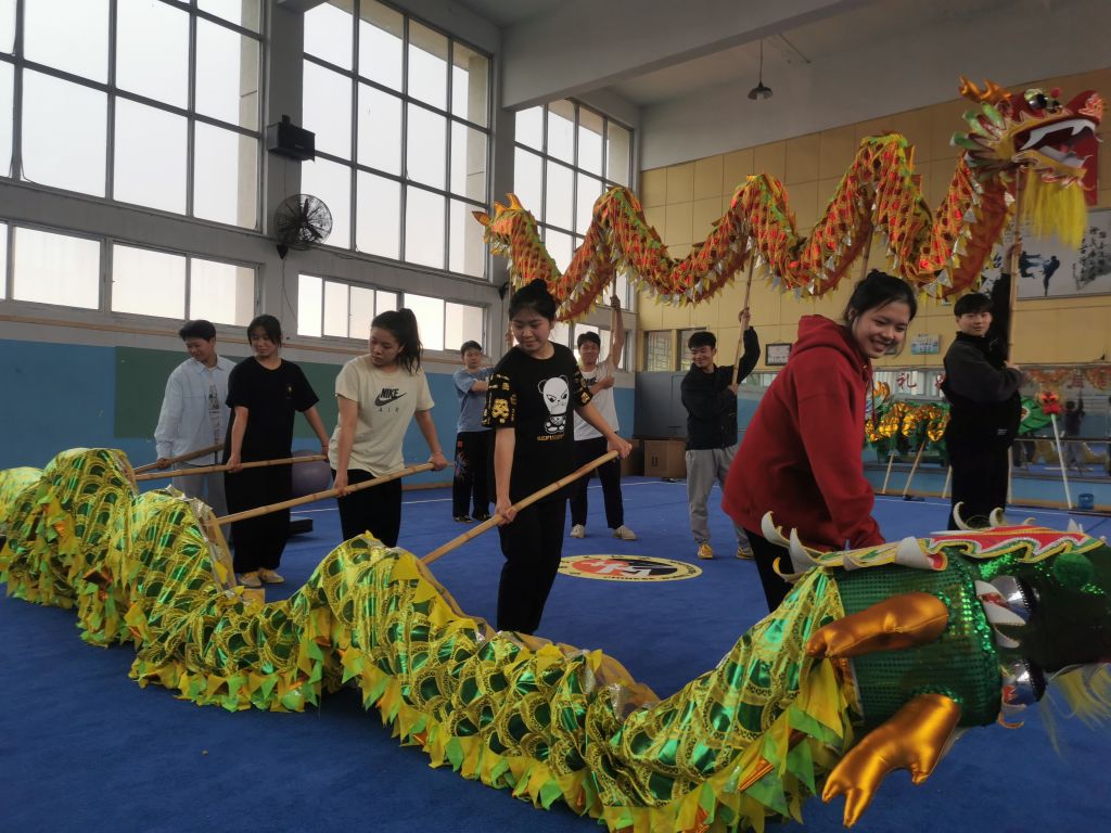 傍晚,湖理校园里的路灯相继亮起。训练场馆内,舞龙的数名参赛选手正分别举着龙头、龙身及龙尾,他们各司其职,每人如星点般的力量一同汇聚在两条龙体上。这两条龙便是体育学院学生欧阳柯彤所在队伍注重的核心。