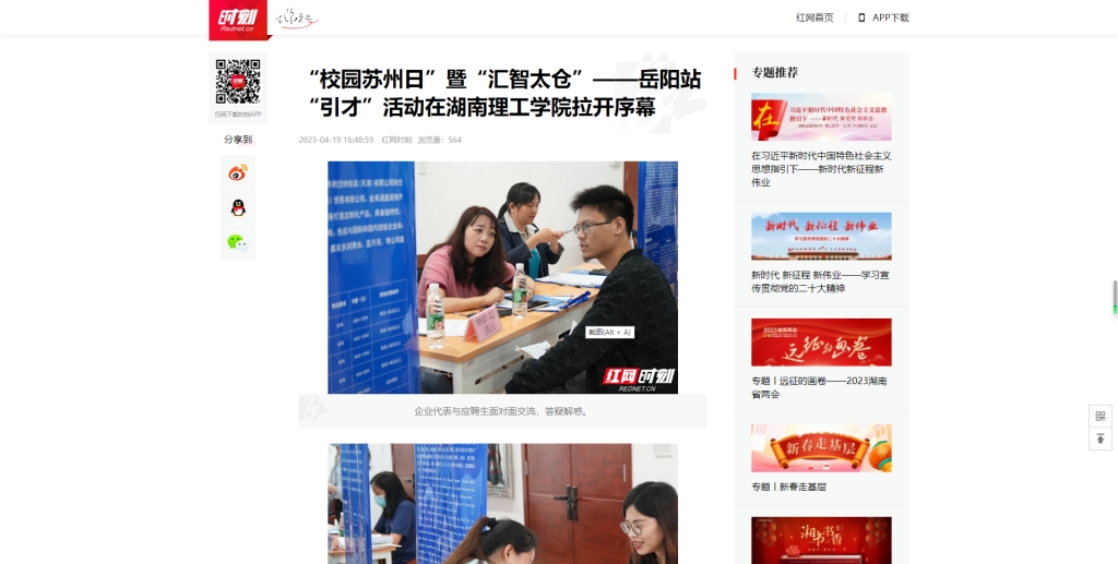 红网时刻岳阳4月19日讯(通讯员 刘鑫)设置固定展位展板、发放宣传单、面对面交流……招聘现场人头攒动,应聘生排队扫描二维码有序进入招聘会场,手持精心准备的求职简历、毕业生推荐表、实习证明,穿梭于人流之中,积极与招聘人员交流,主动了解用人单位相关概况。4月18日,“校园苏州日”暨“汇智太仓”——岳阳站“引才”活动在湖南理工学院拉开序幕。