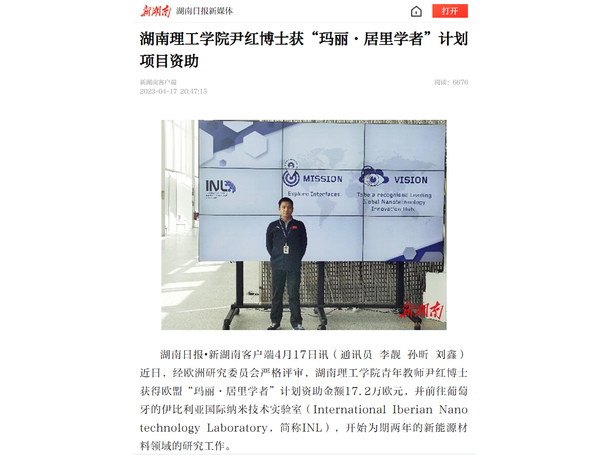 湖南日报•新湖南客户端4月17日讯(通讯员 李靓 孙昕 刘鑫)近日,经欧洲研究委员会严格评审,湖南理工学院青年教师尹红博士获得欧盟“玛丽·居里学者”计划资助金额17.2万欧元,并前往葡萄牙的伊比利亚国际纳米技术实验室(International Iberian Nanotechnology Laboratory,简称INL),开始为期两年的新能源材料领域的研究工作。