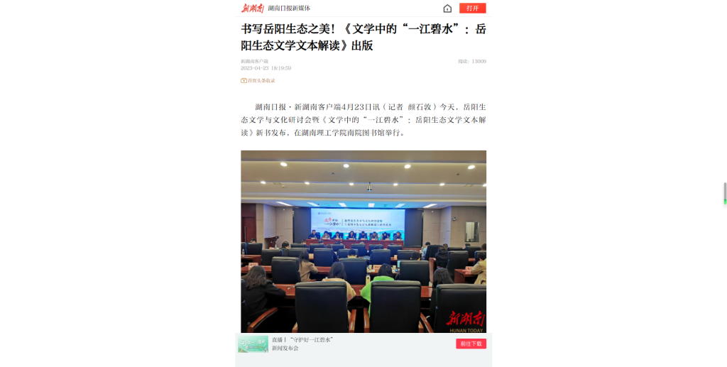 湖南日报·新湖南客户端4月23日讯(记者 颜石敦)今天,岳阳生态文学与文化研讨会暨《文学中的“一江碧水”:岳阳生态文学文本解读》新书发布,在湖南理工学院南院图书馆举行。