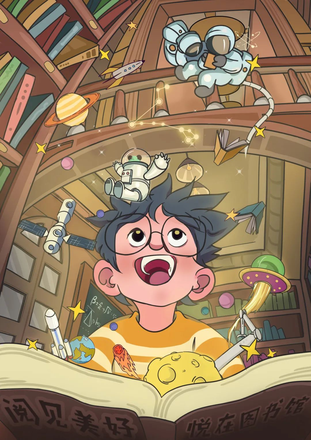 以阅读为城,以书本为家。作品中的孩子翻开书本,代表着人类顶端的科技、思想、理论喷涌而出,散成漫天星光等待翻阅之人尽数阅览吸收。进入书城,放松、惬意、舒适、自在的氛围是它的主基调,在这里生活的小人可以抛开一切烦恼,打破外界因素的桎梏,遵循内心的想法做自己喜欢的事情。“在设计作品的时候,我们希望可以通过这幅海报引起大家对阅读的兴趣,做了很多尝试。《阅见美好与未来》表达了在阅读中探索,享受阅读乐趣的理念。”正如蒋彬所说的,作品中的小人在阅读中扩展了眼界,放松了身心,阅见了美好,代表了当下全民阅读的新风向。