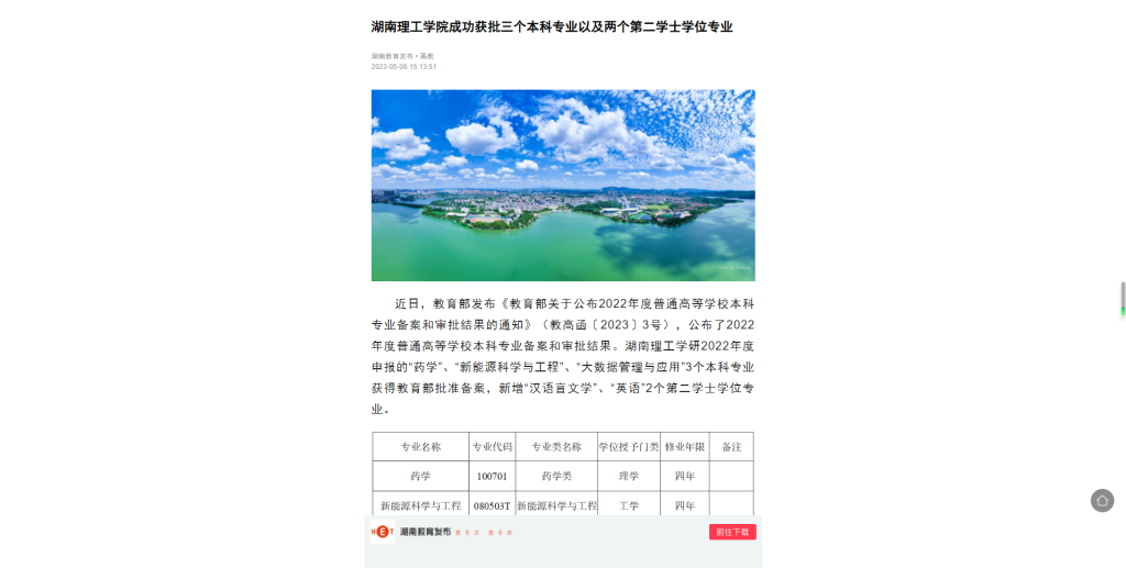 近日,教育部发布《教育部关于公布2022年度普通高等学校本科专业备案和审批结果的通知》(教高函〔2023〕3号),公布了2022年度普通高等学校本科专业备案和审批结果。湖南理工学研2022年度申报的“药学”、“新能源科学与工程”、“大数据管理与应用”3个本科专业获得教育部批准备案,新增“汉语言文学”、“英语”2个第二学士学位专业。