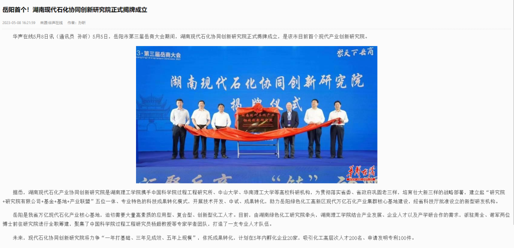据悉,湖南现代石化产业协同创新研究院是湖南理工学院携手中国科学院过程工程研究所、中山大学、华南理工大学等高校科研机构,为贯彻落实省委、省政府巩固老三样,培育壮大新三样的战略部署,建立起“研究院+研究院有限公司+基金+基地+产业联盟”五位一体、专业特色的科技成果转化模式,开展技术开发、中试、成果转化,助力岳阳绿色化工高新区现代万亿石化产业集群核心基地建设,经省科技厅批准设立的新型研发机构。
