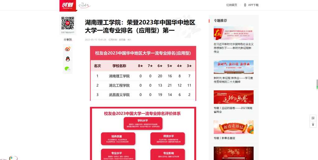 湖南理工学院:荣登2023年中国华中地区大学一流专业排名(应用型)第一