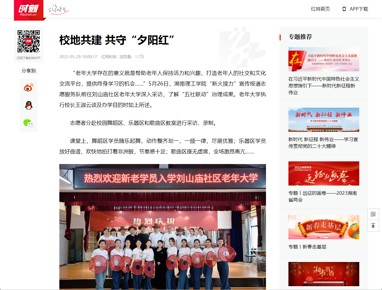 “老年大学存在的意义就是帮助老年人保持活力和兴趣,打造老年人的社交和文化交流平台,提供终身学习的机会……”5月26日,湖南理工学院“新火接力”宣传报道志愿服务队前往刘山庙社区老年大学深入采访,了解“五社联动”治理成果。老年大学执行校长王淑云谈及办学目的时如上所述。