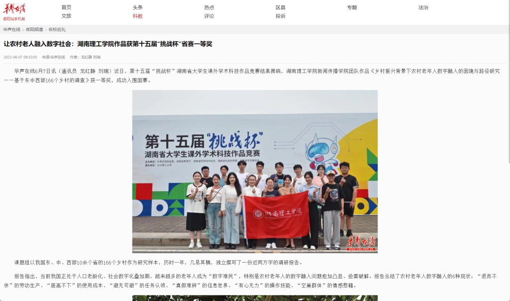 华声在线6月7日讯(通讯员 龙红静 刘瑞)近日,第十五届“挑战杯”湖南省大学生课外学术科技作品竞赛结果揭晓,湖南理工学院新闻传播学院团队作品《乡村振兴背景下农村老年人数字融入的困境与路径研究——基于东中西部166个乡村的调查》获一等奖,成功入围国赛。