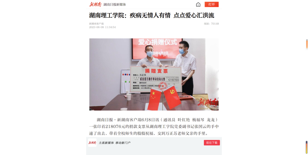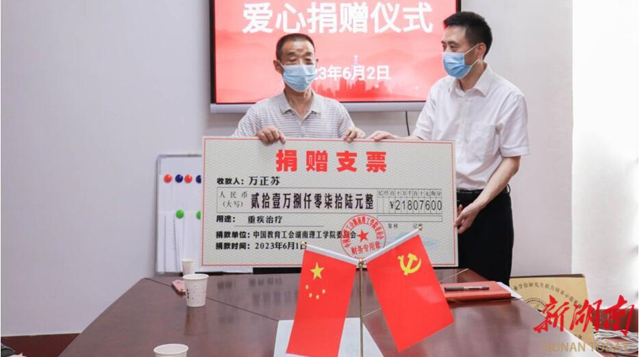 湖南日报·新湖南客户端6月8日讯(通讯员 叶红艳 杨福琴 龙龙)一张印着218076元的捐款支票从湖南理工学院党委副书记张国云的手中递了出去,带着全校师生的殷殷祝福,交到万正苏老师父亲的手里。