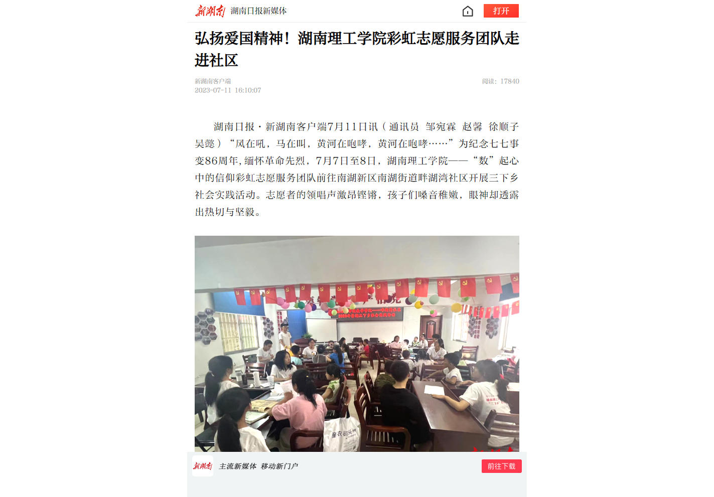 湖南日报·新湖南客户端7月11日讯(通讯员 邹宛霖 赵馨 徐顺子 吴懿)“风在吼,马在叫,黄河在咆哮,黄河在咆哮……”为纪念七七事变86周年,缅怀革命先烈,7月7日至8日,湖南理工学院——“数”起心中的信仰彩虹志愿服务团队前往南湖新区南湖街道畔湖湾社区开展三下乡社会实践活动。志愿者的领唱声激昂铿锵,孩子们嗓音稚嫩,眼神却透露出热切与坚毅。