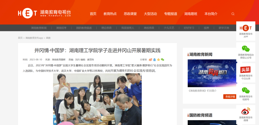 据悉,2023年“井冈情·中国梦”大学生暑期实践季专项活动由团中央青年发展部、全国青少年井冈山革命传统教育基地管理中心组织开展。湖南理工学院深入贯彻落实党的二十大精神,推进思想政治理论课建设改革创新,注重加强校生、校校、校社联系,推动学生在实践中学好一堂“大思政课”。