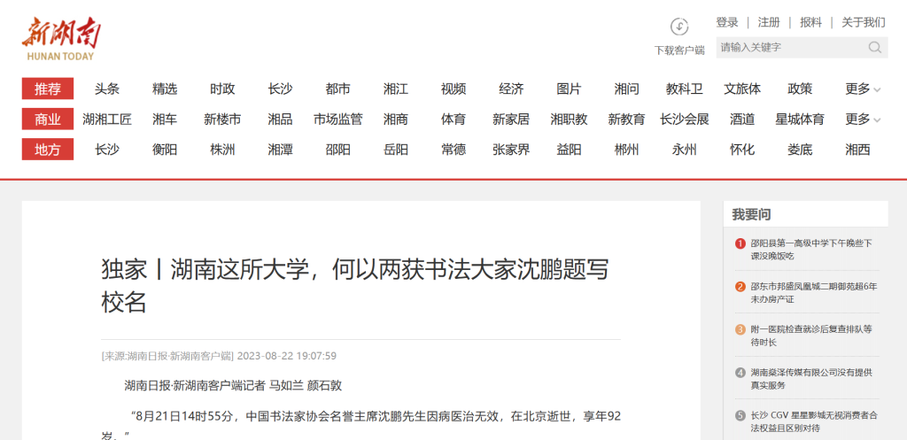 “8月21日14时55分,中国书法家协会名誉主席沈鹏先生因病医治无效,在北京逝世,享年92岁。”