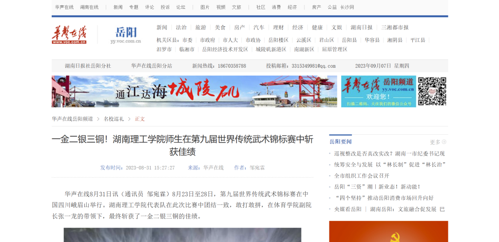 来源:一金二银三铜!湖南理工学院师生在第九届世界传统武术锦标赛中斩获佳绩 名校巡礼 华声在线岳阳频道 (voc.com.cn)