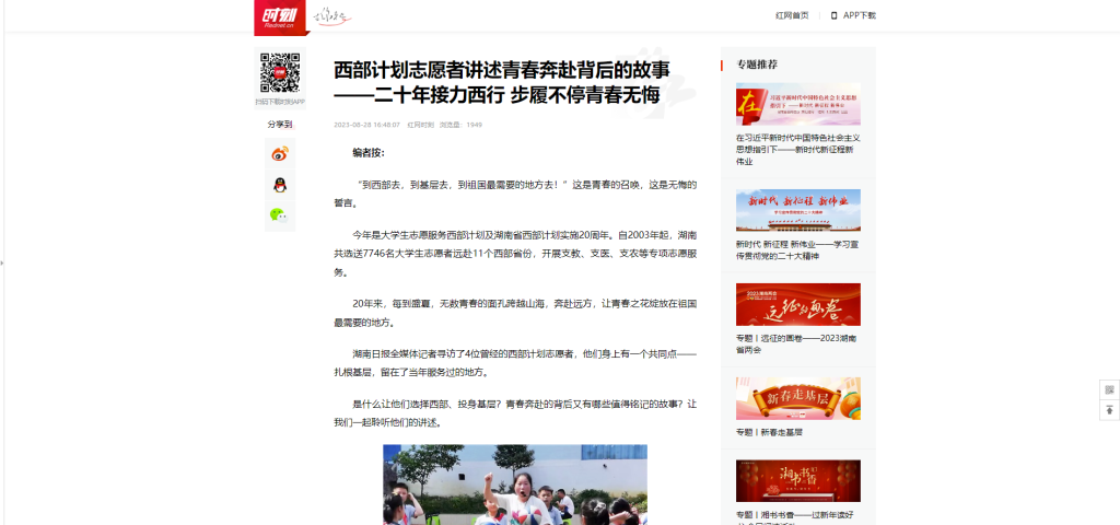 今年是大学生志愿服务西部计划及湖南省西部计划实施20周年。自2003年起,湖南共选送7746名大学生志愿者远赴11个西部省份,开展支教、支医、支农等专项志愿服务。
