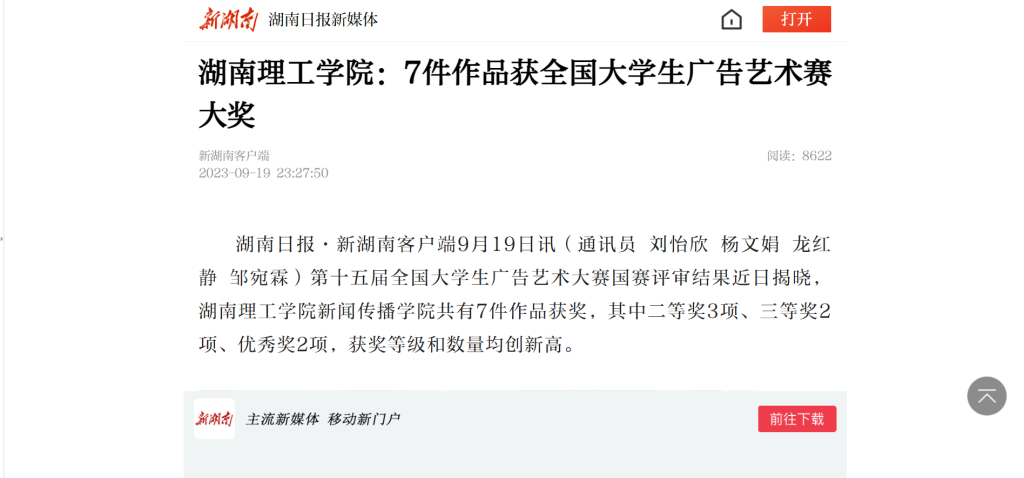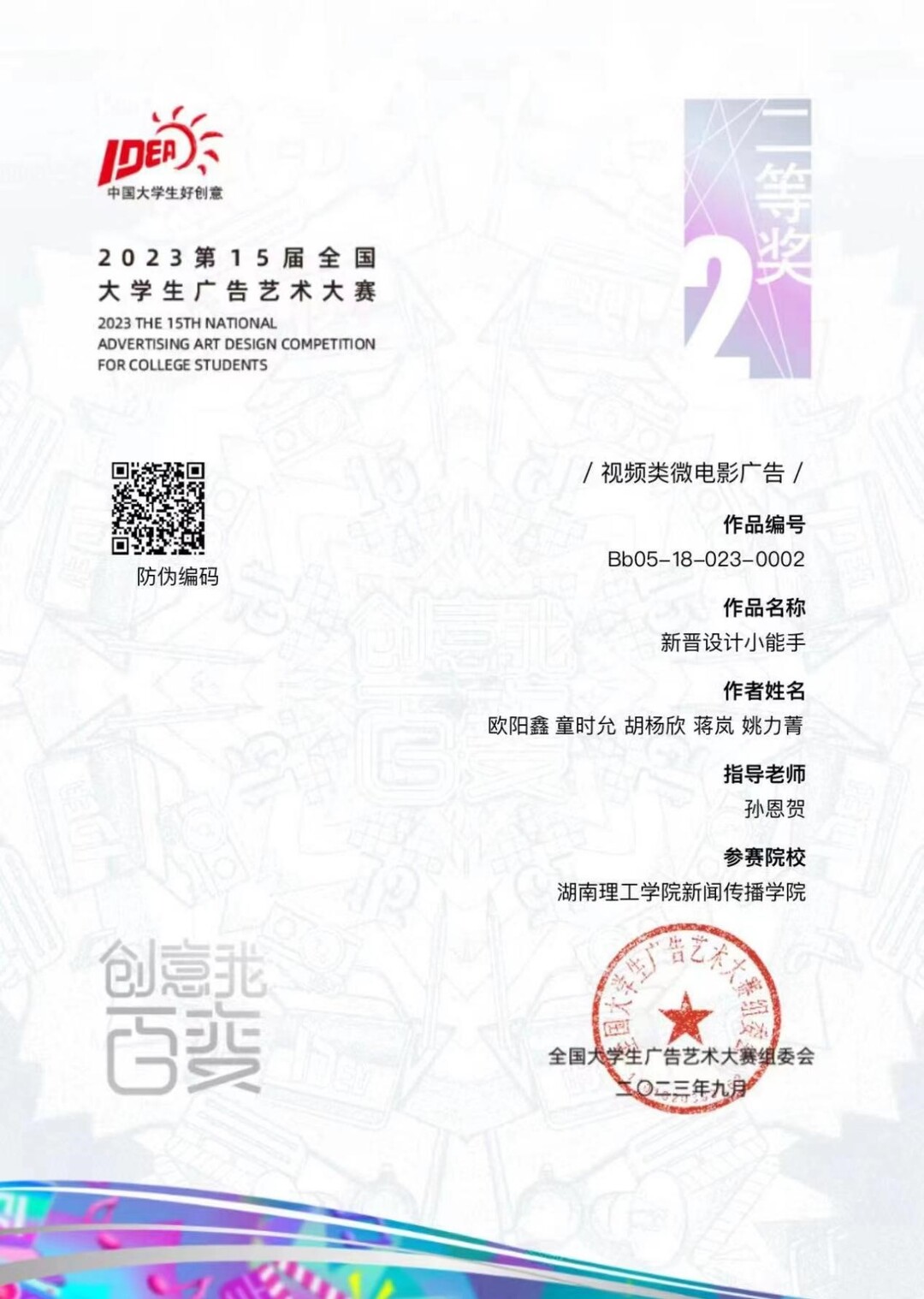 湖南日报·新湖南客户端9月19日讯(通讯员 刘怡欣 杨文娟 龙红静 邹宛霖)第十五届全国大学生广告艺术大赛国赛评审结果近日揭晓,湖南理工学院新闻传播学院共有7件作品获奖,其中二等奖3项、三等奖2项、优秀奖2项,获奖等级和数量均创新高。