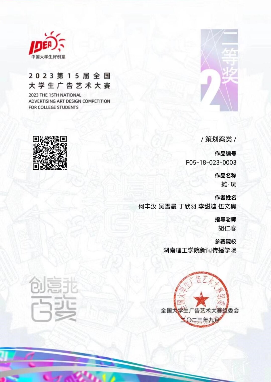 此次比赛中,新闻传播学院学生作品《新晋设计小能手》获视频类微电影广告二等奖;《摊•玩》获策划案类二等奖;《让一切“画”里有话》获文案类长文案二等奖。《表白99次,我恨你雕牌》和《青年答卷》获三等奖。《动感生活》和《可画,成就每一个一分钟》获优秀奖。这是该校积极推动以教促赛、以教促学的良好展示,充分彰显了学生敢于突破常规、探索创新的青春风貌。