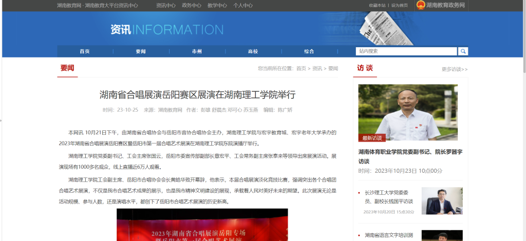 本网讯 10月21日下午,由湖南省合唱协会与岳阳市音协合唱协会主办,湖南理工学院与宏宇教育城、宏宇老年大学承办的2023年湖南省合唱展演岳阳赛区暨岳阳市第一届合唱艺术展演在湖南理工学院东院演播厅举行。