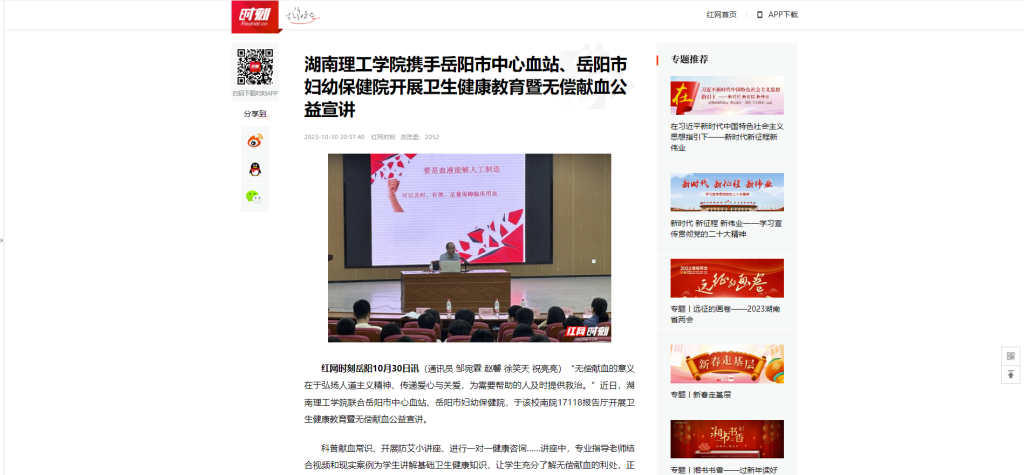 湖南理工学院携手岳阳市中心血站、岳阳市妇幼保健院开展卫生健康教育暨无偿献血公益宣讲