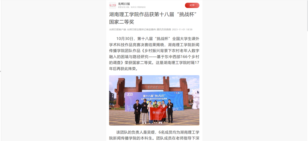 10月30日,第十八届“挑战杯”全国大学生课外学术科技作品竞赛决赛结果揭晓,湖南理工学院新闻传播学院团队作品《乡村振兴背景下农村老年人数字融入的困境与路径研究——基于东中西部166个乡村的调查》荣获国家二等奖。这是湖南理工学院时隔17年后再获此殊荣。