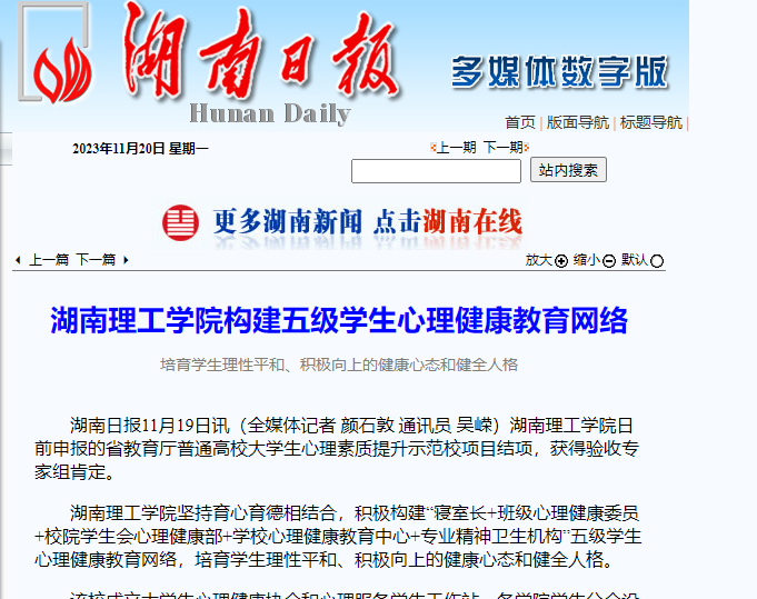 湖南日报11月19日讯(全媒体记者 颜石敦 通讯员 吴嵘)湖南理工学院日前申报的省教育厅普通高校大学生心理素质提升示范校项目结项,获得验收专家组肯定。