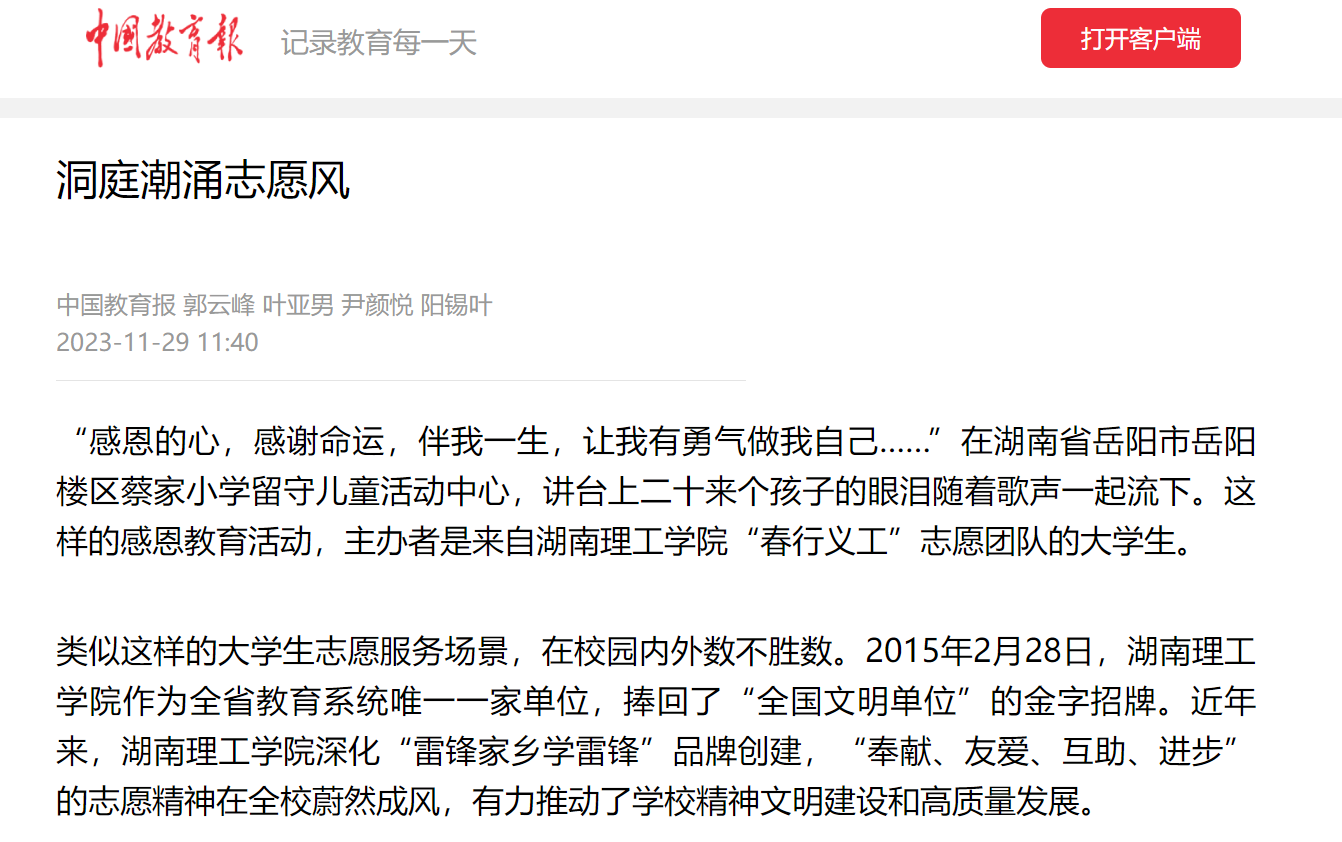 类似这样的大学生志愿服务场景,在校园内外数不胜数。2015年2月28日,湖南理工学院作为全省教育系统唯一一家单位,捧回了“全国文明单位”的金字招牌。近年来,湖南理工学院深化“雷锋家乡学雷锋”品牌创建,“奉献、友爱、互助、进步”的志愿精神在全校蔚然成风,有力推动了学校精神文明建设和高质量发展。