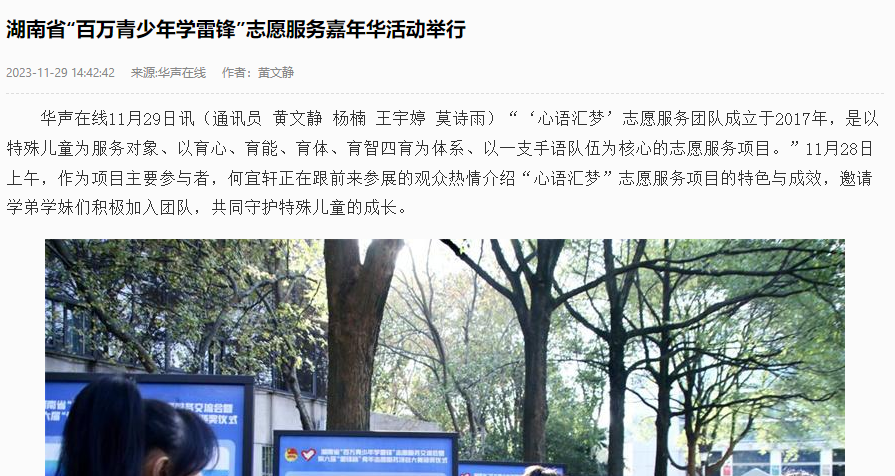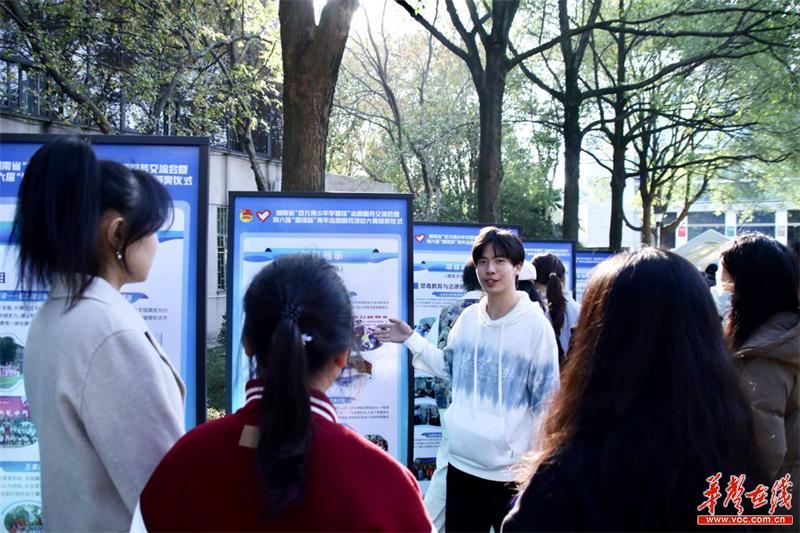 华声在线11月29日讯(通讯员 黄文静 杨楠 王宇婷 莫诗雨)“‘心语汇梦’志愿服务团队成立于2017年,是以特殊儿童为服务对象、以育心、育能、育体、育智四育为体系、以一支手语队伍为核心的志愿服务项目。”11月28日上午,作为项目主要参与者,何宜轩正在跟前来参展的观众热情介绍“心语汇梦”志愿服务项目的特色与成效,邀请学弟学妹们积极加入团队,共同守护特殊儿童的成长。