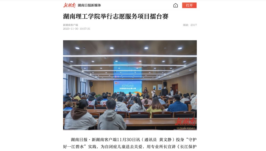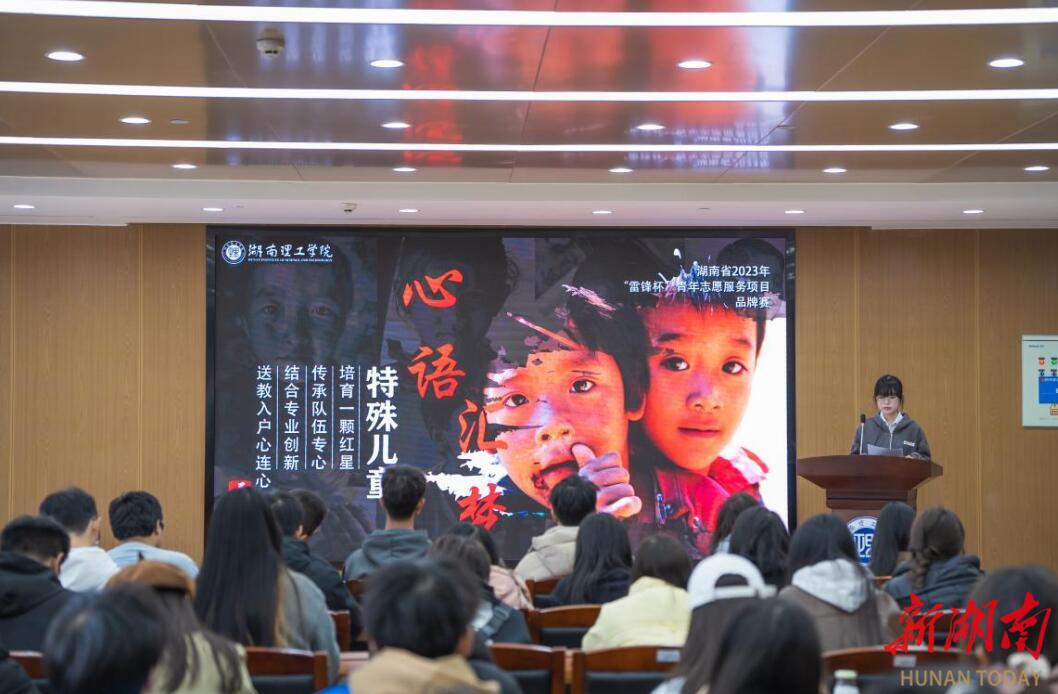 湖南日报·新湖南客户端11月30日讯(通讯员 黄文静)投身“守护好一江碧水”实践,为自闭症儿童送去关爱,用专业所长宣讲《长江保护法》……11月28日,湖南理工学院举行志愿服务项目擂台赛。来自机械学院、土木建筑工程学院、音乐学院、法学院的五支优秀志愿服务项目负责人同台比拼,为学校志愿服务高质量发展树立标杆。