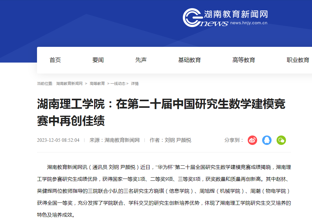湖南教育新闻网讯(通讯员 刘钢 尹颜悦)近日,“华为杯”第二十届全国研究生数学建模竞赛成绩揭晓,湖南理工学院参赛研究生成绩优异,获得国家一等奖1项、二等奖9项、三等奖8项,获奖数量和质量再创新高。其中赵林、吴健辉两位教师指导的三院联合小队的三名研究生方晓琪(信息学院)、周旭辉(机械学院)、周潮(物电学院)获得全国一等奖,充分发挥了学院联合、学科交叉的研究生创新培养优势,体现了湖南理工学院研究生交叉培养的特色及培养成效。
