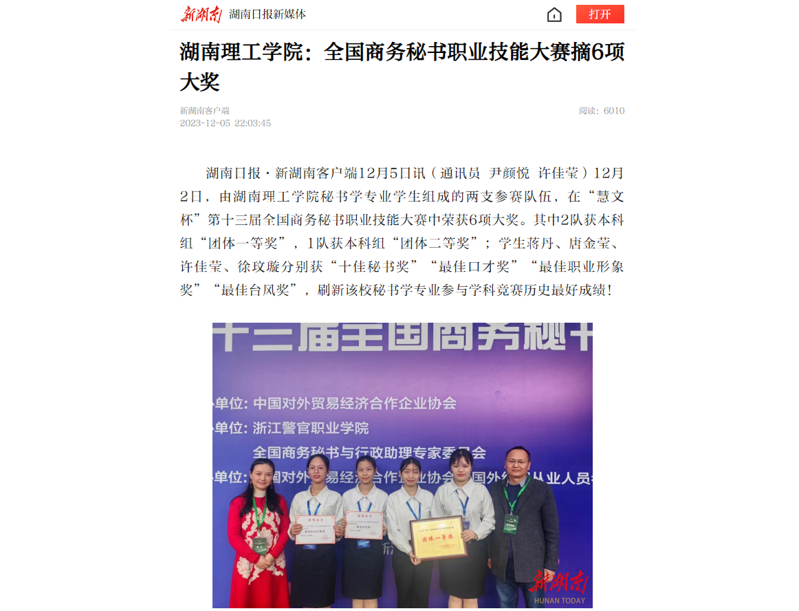 湖南日报·新湖南客户端12月5日讯(通讯员 尹颜悦 许佳莹)12月2日,由湖南理工学院秘书学专业学生组成的两支参赛队伍,在“慧文杯”第十三届全国商务秘书职业技能大赛中荣获6项大奖。其中2队获本科组“团体一等奖”,1队获本科组“团体二等奖”;学生蒋丹、唐金莹、许佳莹、徐玟璇分别获“十佳秘书奖”“最佳口才奖”“最佳职业形象奖”“最佳台风奖”,刷新该校秘书学专业参与学科竞赛历史最好成绩!