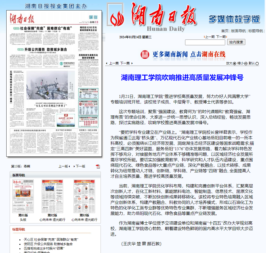 1月21日,湖南理工学院“推进学校高质量发展,努力办好人民满意大学”专题培训班开班,该校班子成员、中层骨干、教授博士代表等参加。 这次专题培训,聚焦“强国建设、教育何为”的时代课题和“教育强省、湖理有责”的使命任务,大家进一步统一思想认识,深入总结经验,畅谈发展思路,探讨实施路径,吹响学校推进高质量发展冲锋号。 “要把学科专业建立在产业链上。”湖南理工学院校长曾祥君表示,学校作为我省通江达海“桥头堡”、万亿现代石化产业核心基地岳阳目前唯一的一所本科高校,必须围绕长江经济带发展、洞庭湖生态经济区建设等国家战略需求,锚定“三高四新”美好蓝图,服务岳阳“1376”总体发展思路,着力解决学科特色发挥不够充分,对接服务地方产业体系不够精准等问题,以区域经济社会发展所需尽学校所能。要切实加强教育教学、科学研究和人才队伍内涵建设,重点围绕现代石化、绿色食品等9大重点产业链,深化产教融合,以技术转移、成果转化为纽带推动人才链、创新链、学科链、产业链等“四链”融合, 全面提高人才自主培养质量,推进学校高质量发展。 当前,湖南理工学院优化学科布局,构建和完善创新平台体系,汇聚高层次创新人才,在化工新材料、氢能燃料电池、智能制造、信息技术、屈原文化等领域持续突破,不断加快创新成果转移转化。该校将专业特色培育融入区域产业创新体系,构建产教融合、科教协同的人才培养模式,形成以石油化工为特色的化学化工类专业群等优势特色专业集群,不断增强服务区域经济社会发展能力,助力岳阳现代石化、绿色食品等重点产业链发展。 作为湖南省博士学位授予立项建设单位和湖南省“十四五”改办大学规划高校,湖南理工学院信心勃勃,朝着建设特色鲜明的国内高水平大学目标大步迈进。 (王庆华 楚 霖 颜石敦) 来源:http://epaper.voc.com.cn/hnrb/html/2024-01/24/content_1669621.htm?div=-1 |
