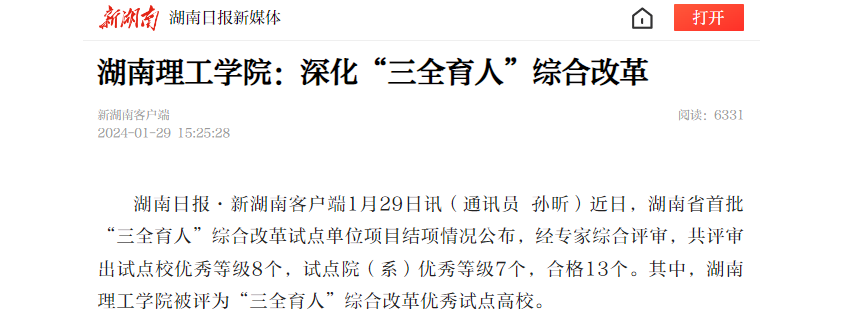 湖南日报·新湖南客户端1月29日讯(通讯员 孙昕)近日,湖南省首批“三全育人”综合改革试点单位项目结项情况公布,经专家综合评审,共评审出试点校优秀等级8个,试点院(系)优秀等级7个,合格13个。其中,湖南理工学院被评为“三全育人”综合改革优秀试点高校。