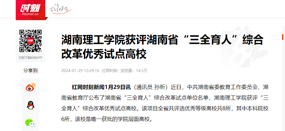 红网时刻新闻1月29日讯(通讯员 孙昕)近日,中共湖南省委教育工作委员会、湖南省教育厅公布了湖南省“三全育人”综合改革试点单位名单,湖南理工学院获评“三全育人”综合改革优秀试点高校。该项目全省共评选优秀等级高校共8所,其中本科院校6所,该校是唯一获批的学院层面高校。
