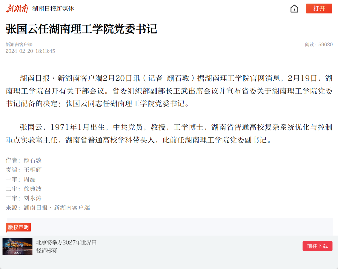 湖南日报·新湖南客户端2月20日讯(记者 颜石敦)据湖南理工学院官网消息,2月19日,湖南理工学院召开有关干部会议。省委组织部副部长王武出席会议并宣布省委关于湖南理工学院党委书记配备的决定:张国云同志任湖南理工学院党委书记。