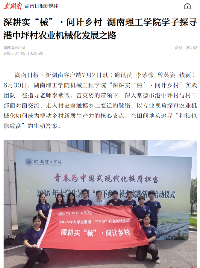 湖南日报·新湖南客户端7月2日讯(通讯员李紫薇曾英姿钱颖)6月30日,湖南理工学院机械工程学院“深耕实‘械’·问计乡村”实践团队,在指导老师李紫薇、曾英姿的带领下,深入常德市港中坪村与村干部面对面交流,走入村史馆触摸乡土变迁的脉络,以专业视角探查农业机械化如何成为撬动乡村新质生产力的核心支点,在田间地头追寻“种粮也能致富”的生动答案。