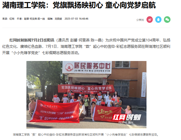 为庆祝中国共产党成立第104周年,弘扬红色文化,赓续红色血脉,7月1日,湖南理工学院“数”起心中的信仰-彩虹志愿服务团在畔湖湾社区顺利开展“小小先锋学党史”七彩假期志愿服务活动。