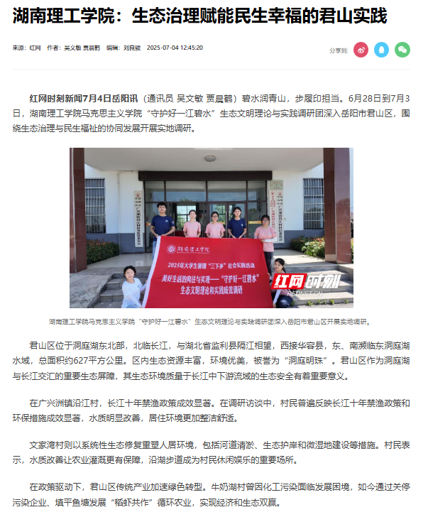 碧水润青山,步履印担当。6月28日到7月3日,湖南理工学院马克思主义学院“守护好一江碧水”生态文明理论与实践调研团深入岳阳市君山区,围绕生态治理与民生福祉的协同发展开展实地调研。