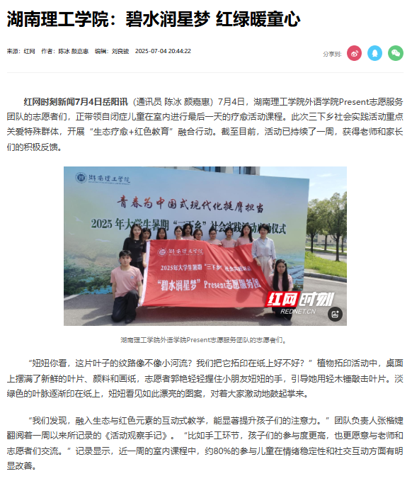 红网时刻新闻7月4日岳阳讯(通讯员 陈冰 颜嘉惠)7月4日,湖南理工学院外语学院Present志愿服务团队的志愿者们,正带领自闭症儿童在室内进行最后一天的疗愈活动课程。此次三下乡社会实践活动重点关爱特殊群体,开展“生态疗愈+红色教育”融合行动。截至目前,活动已持续了一周,获得老师和家长们的积极反馈。