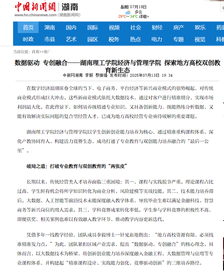 六载深耕,团队以“数据为驱动引擎、专创融合为实施路径”,成功探索出一条独具特色的地方高校人才培养之路:淘汰12门滞后课程,将技术类课程学分占比从15%提升至30%;建成“金融大数据分析”等7个企业级实训平台,使学生入职适应周期缩短40%;出版4部创新创业教材,多项教研成果获得教育部、湖南省教育厅课题立项支持。该成果依托动态化课程体系、场景化实训平台和常态化竞赛机制,为地方高校破解专业教育与创新创业融合难题,提供了可复制、可推广的解决方案,打造出地方高校双创教育的“湖理工范式”。在数字经济蓬勃发展的浪潮中,湖南理工学院经济与管理学院正以创新为翼,持续为区域发展培育一批又一批“懂数据、通专业、善创新”的新商科精英人才。(完)