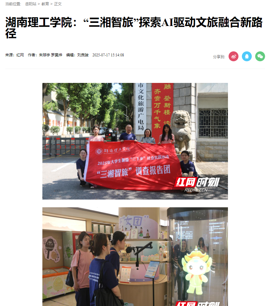 红网时刻新闻7月17日岳阳讯(通讯员 朱琼宇 罗昊烨)在第四届湖南旅发大会成功举办之际,7月9日—11日,湖南理工学院经济与管理学院“三湘智旅”调查报告团奔赴岳阳市多地开展暑期“三下乡”社会实践活动。团队成员走进岳阳市文旅局、岳阳市博物馆、岳阳楼景区、洞庭湖博物馆等调研现场,以“生态、文旅、科技”为主线,解锁AI技术在文旅领域的应用密码。